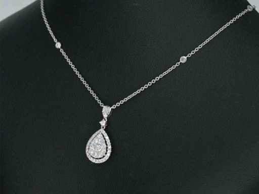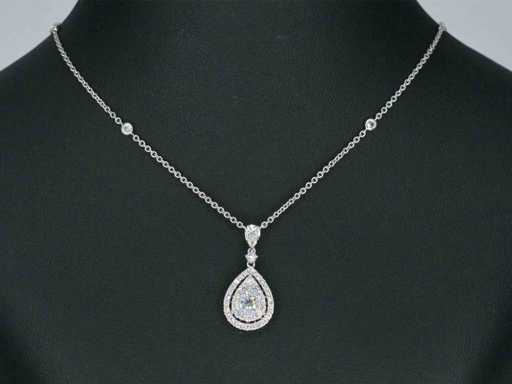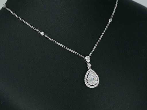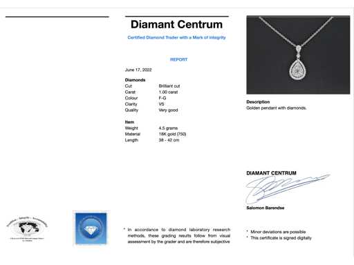 Diamant: Natural; Tăietură: Tăietură genială; Greutate (carate): 1,00 carate; Culoare: F-G; Puritate: SUA; Calitatea tăieturii: Foarte frumoasă; Bijuterie: Pandantiv (inclusiv colier); Greutate: 4,5 uncii; Dimensiuni/lungime: 38 - 42 cm (reglabil); Material: aur 18K (750); Starea: Nouă; Ambalare: Cutie de bijuterii de lux; Explicație: Calitatea a fost preluată din raportul aferent produsului. Evaluarea este o evaluare a unui comerciant certificat de diamante, bazată pe prețurile pentru consumatori; Preț pentru consumatori: 9.678 €
