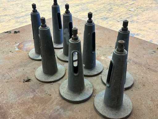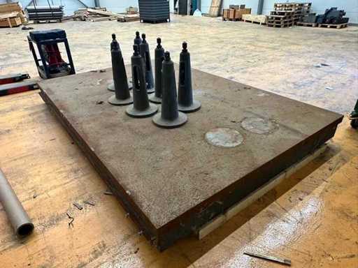Placă de bază grea din oțel cu opt suporturi reglabile în înălțime. Placă dreptunghiulară, solidă de oțel (verificați dimensiunile și grosimea la fața locului), suprafața ruginită dar stabilă. Opt suporturi conice de nivelare cu bază rotundă și șurub de avans pentru alinierea precisă a utilajelor grele. Ideal ca fundație de mașină, câmp de testare sau platformă de lucru grea;