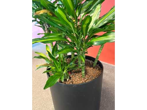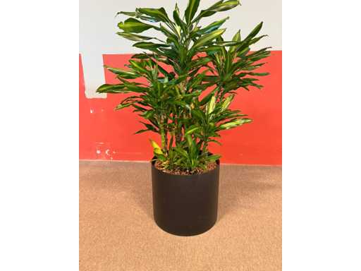 Dracaena decorativă (cu mai multe tulpini) așezată într-un ghiveci rotund, cu design negru. Foarte potrivit pentru spații de birouri, holuri de intrare sau zone de așteptare. Planta este cultivată în hidroponie cu hidrogranule și, prin urmare, este ușor de întreținut.