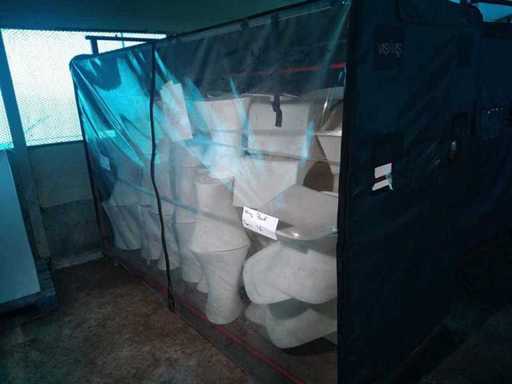 Căruciorul industrial 2620*1100*1850 conținând 48 de saci de fasole albi din PLASTIC și 16 saci de scaune pentru ala