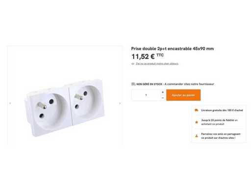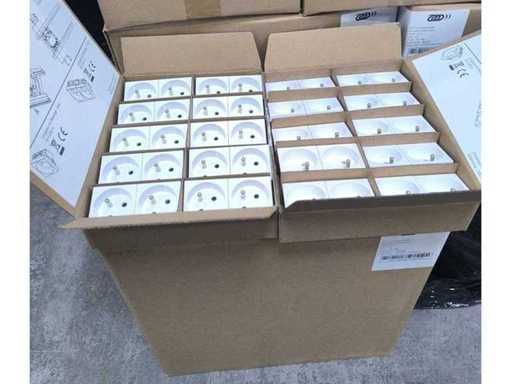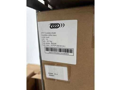 Priză dublă cu 2 poli + împământare înclinată de 45°, încastrată 45x90 mm 16A 230V. Conexiune rapidă fără unelte prin terminale automate pentru fire rigide de 2,5mm², deconectare prin acțiune simplă a manetelor.