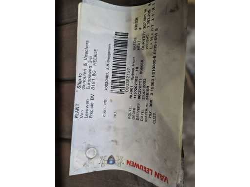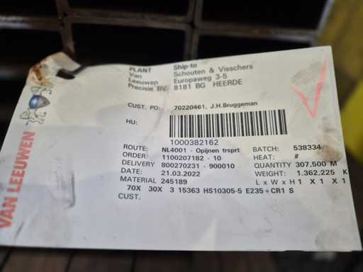 Secțiuni de cutie de oțel E235 + CR1 S2, dimensiune 70x30x3mm Lungime 6150mm, furnizor Leeuwen Precision BV, număr de pachete: 2, greutate per pachet aproximativ 1362kg total: 2724kg
