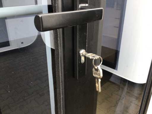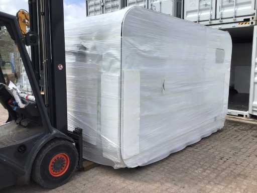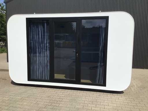Pereți și acoperiș izolați; cadre din aluminiu cu geamuri duble cu control solar; încuiabil cu cheie și cilindru de mâner; fereastră suspendată deasupra; dimensiuni de transport 3950x2300x2450 mm (LXWXH); ridicând ochii; cadru inferior cu găuri pentru linguriță și picioare reglabile; (acest lot încape în containerul LYPU de 40 ft); nefolosit ©