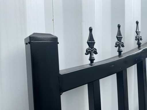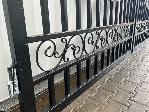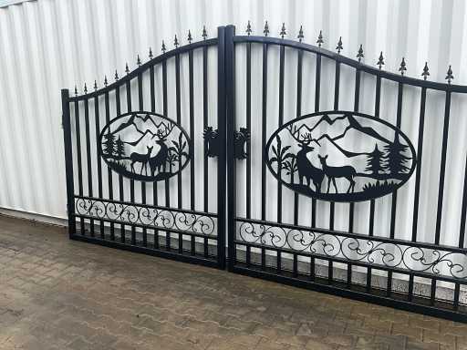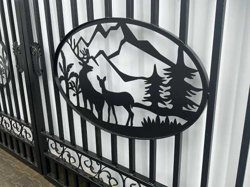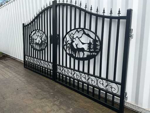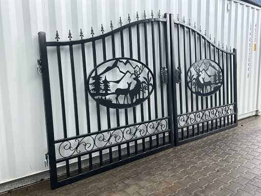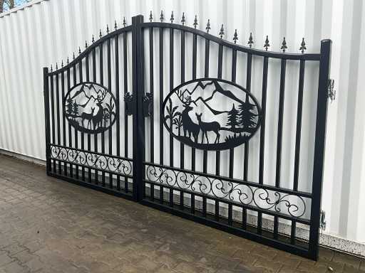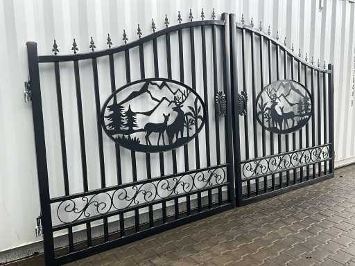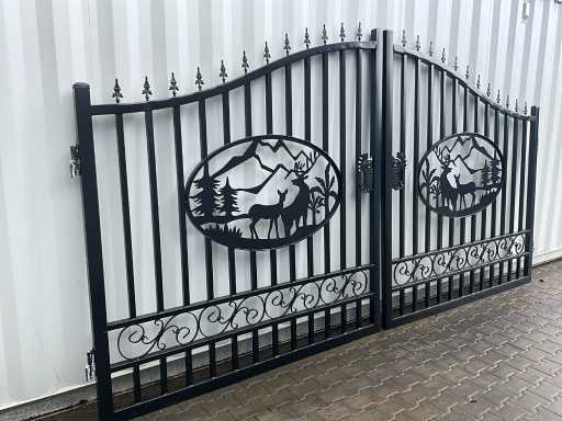echipată cu strat negru cu pulbere / finisaj lăcuit; 2300 mm înălțime în mijloc; 1800 mm înălțime la capăt; cadru - părți laterale și jos: tub de 50 x 50 x 2 mm; cadru – tub interior de 20 x 20 x 1,2 mm; design animal 1300x700mm/1430x880mm; balama v.v. sudată; model: Deere; Culoare: Negru; © nefolosit; Lățimea porții grădinii cu pasaj liber aprox. 4200 mm