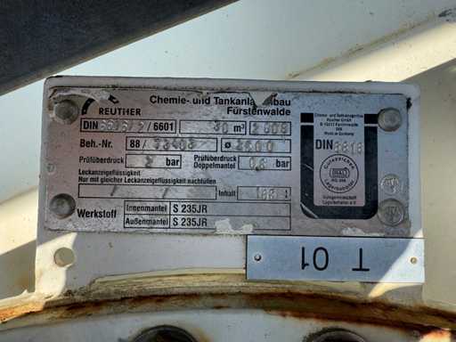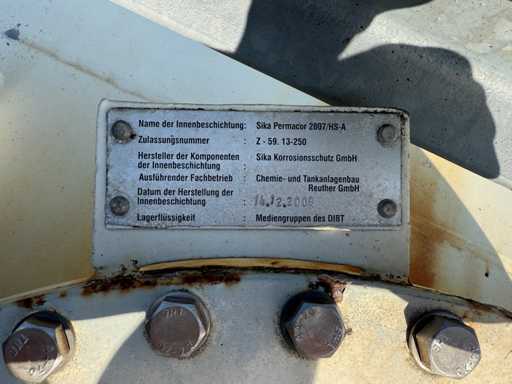 rezervor de stocare cu pereți dubli de la marca Reuther, fabricat din metal și echipat cu o capacitate de 30.000 de litri. Construit în 2009, acest rezervor este conceput pentru depozitarea în siguranță a lichidelor în medii industriale; Interiorul rezervorului este acoperit cu Sika Permacor 2807/HS-A, un strat industrial care oferă protecție împotriva coroziunii și a influențelor chimice. Pentru diverse aplicații în care integritatea și siguranța produsului sunt centrale.
