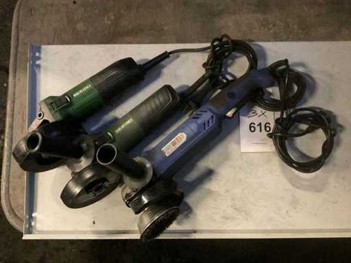 2 piese discuri de rectificat unghiular Hikoki, tip G 13STA(S) anul de construcție 2021 și tipul G13SR4, anul construcției 2023 și o piesă HBM, disc de rectificat unghiular tip 8434, conexiune 230v.