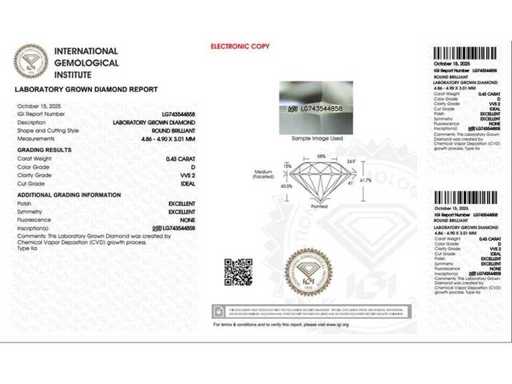 This lab-grown diamond comes with an official IGI certificate and report confirming its quality. View the certificate in the photos or refer to the table above for the detailed specifications. All characteristics have been taken directly from the accompanying IGI report.