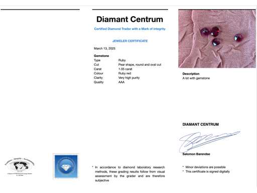 înaltă Piatră prețioasă: Rubin; Cantitate: 4 piese; Tăietură: Formă de pară, rotundă și ovală; Greutate (carate): 1,05 carate; Culoare: roșu rubiniu; Puritate: Puritate foarte ridicată; Clasă: AAA; Starea: Nouă; Ambalare: Cutie cu pietre prețioase; Explicație: Calitatea a fost preluată din raportul aferent produsului. Evaluarea este o evaluare a unui comerciant certificat de diamante, bazată pe prețurile pentru consumatori; Preț pentru consumatori: € 4.950