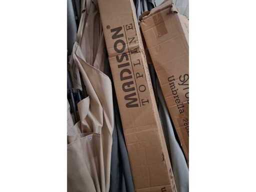 Parasolul Saint Tropez de la marca Madison este un parasol cu consolă complet funcțional. Deschiderea și închiderea se fac ușor prin mecanismul de înfășurare. În plus, umbrela poate fi rotită și înclinată la 360 de grade, astfel încât poți crea întotdeauna umbra optimă. Inclusiv: picior de umplutură (85kg) și protecție