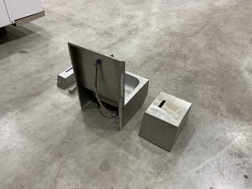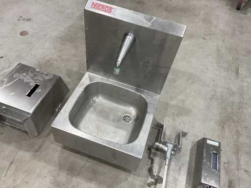 Chiuvetă din oțel inoxidabil cu robinete acționate la genunchi; suport pentru role de hârtie; Distribuitor de săpun