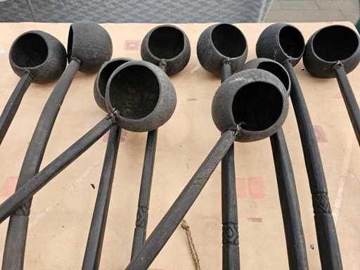 Aduceți o notă autentică, africană, în casă cu acest set impresionant de 10 piese de polonice de calabash făcute manual. Fiecare piesă impresionează prin aspectul său rustic, constând într-un bol natural din nucă de cocos ca recipient și un mâner artistic sculptat din lemn închis la culoare. Cu o lungime impresionantă de 100 cm, aceste obiecte nu sunt doar unelte funcționale, ci mai presus de toate elemente de design remarcabile pentru decorațiuni de perete sau aranjamente mari de vase.