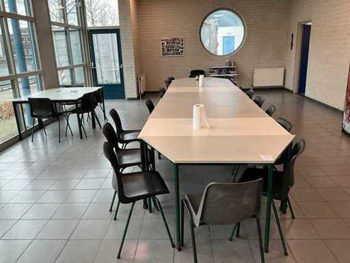 Setul de cantină constând din: (9x) mese drepte, (2x) mese trapezoidale, (24x) scaune de cantină stivuitoare.