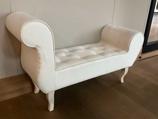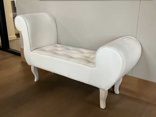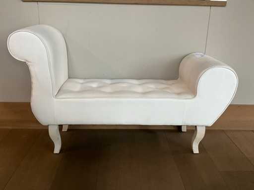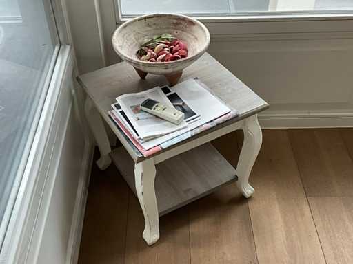 Complet cu canapea din material textil aproximativ 120 x 40 x 74cm și masă laterală din lemn aproximativ 45 x 45 x 45cm