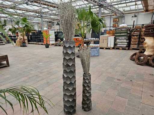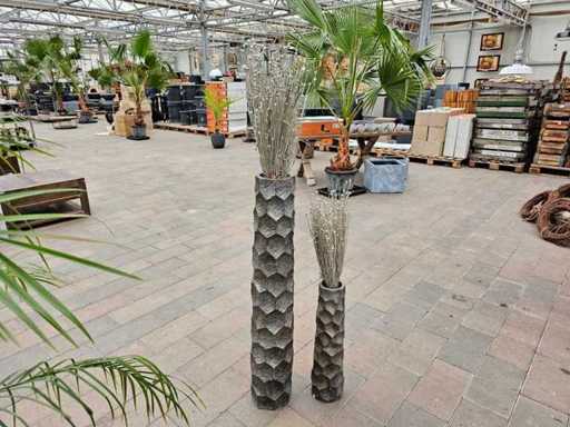 Adaugă o notă modernă și elegantă spațiului tău de locuit sau zonei de intrare cu acest set exclusiv de două vaze texturate din fibră de sticlă. Vasele prezintă o structură superficială impresionantă, asemănătoare unui fagure de miere, din antracit sofisticat, și vin cu flori artificiale decorative, argintii. Datorită materialului robust din fibră de sticlă, acestea sunt durabile, dar ușor de transportat. O adevărată atracție pentru stiluri de interior minimaliste sau moderne.