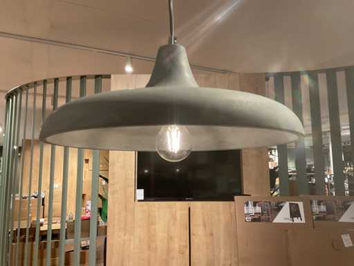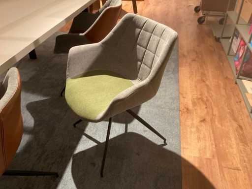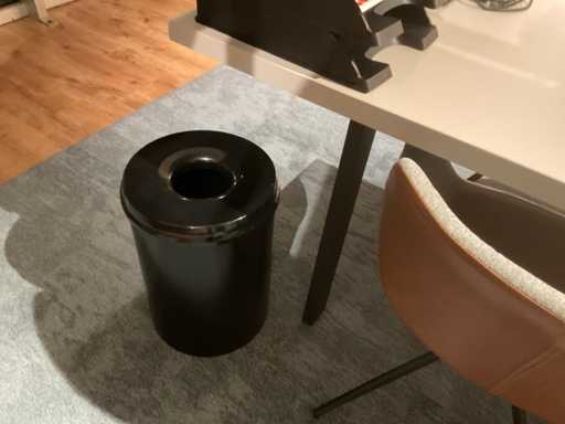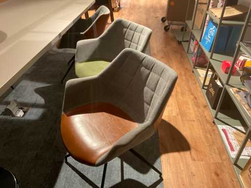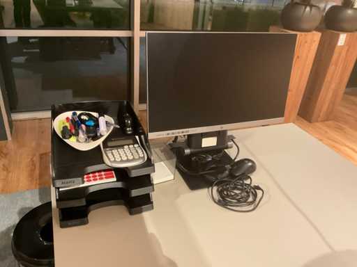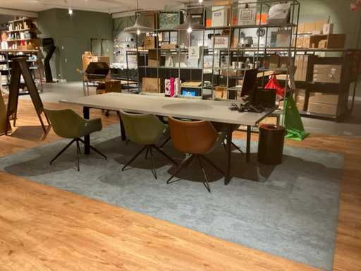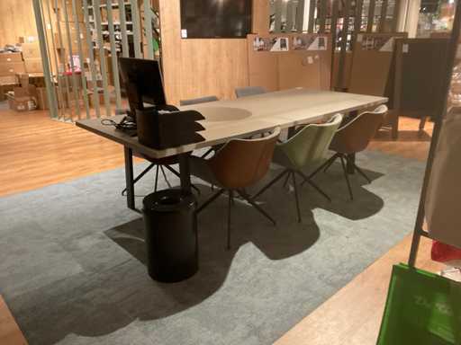 Compus din masă, aprox. 275x110x77 cm, 6 scaune în 2 culori, monitor, HP e223, mouse computer, articole de papetărie, coșuri de gunoi și 2 lămpi suspendate.