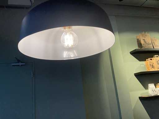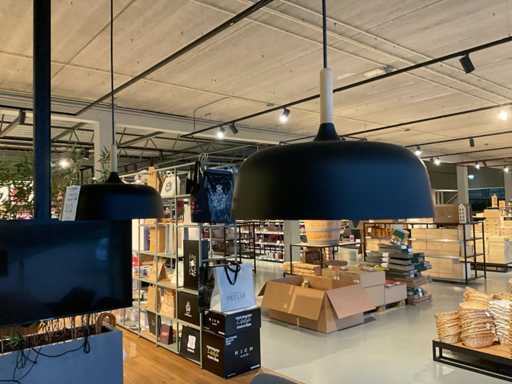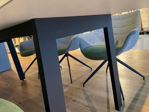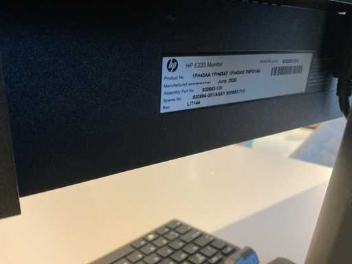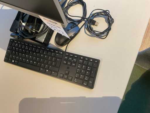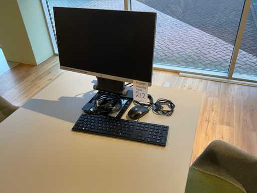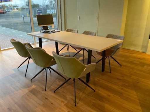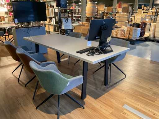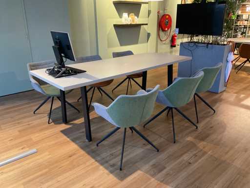 Compus din masă, aprox. 225x90x75 cm, inclusiv 6 scaune în 2 culori, monitor HP, tip e223 cu tastatură și mouse pentru computer și 2 lămpi suspendate.