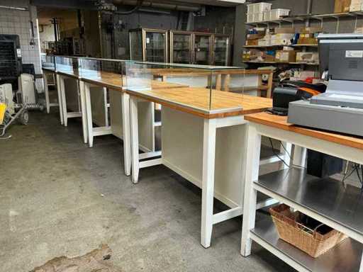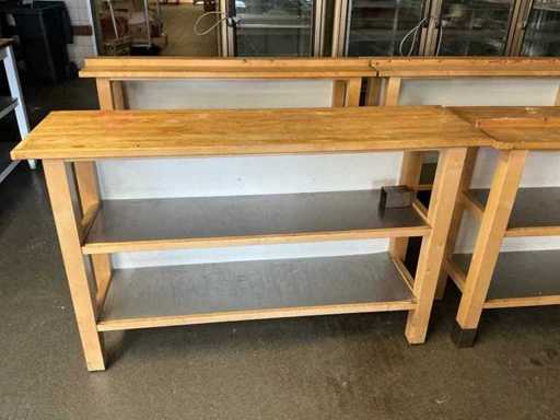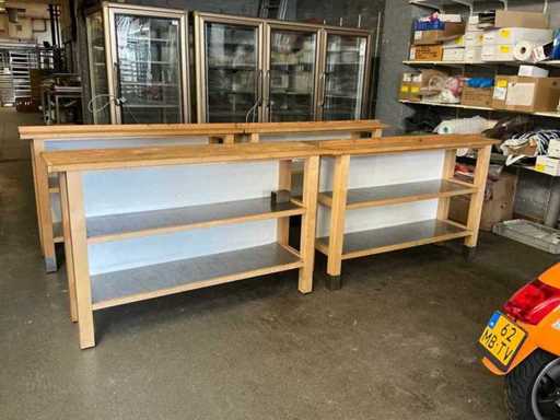 4x display table 126x78x115 cm; 4x work table 146x40x90 cm; wood
