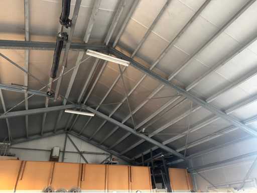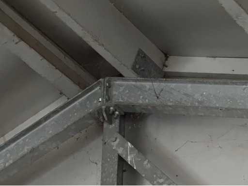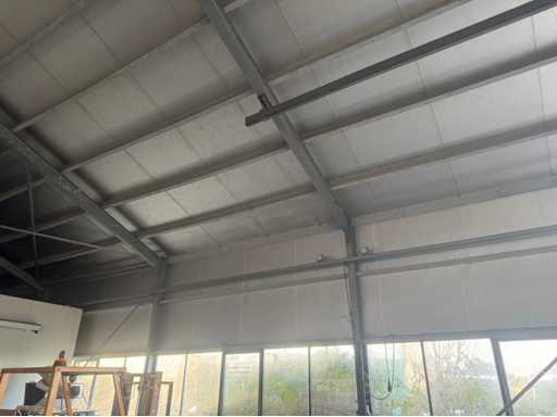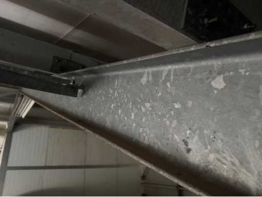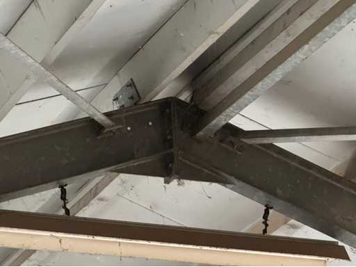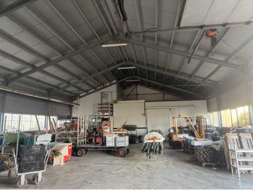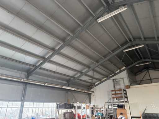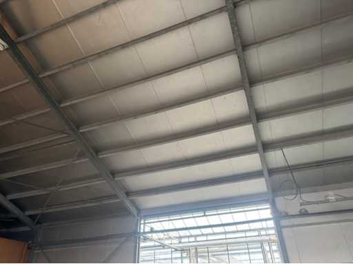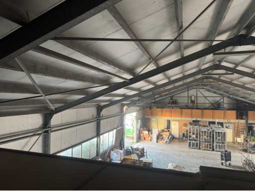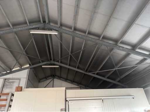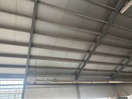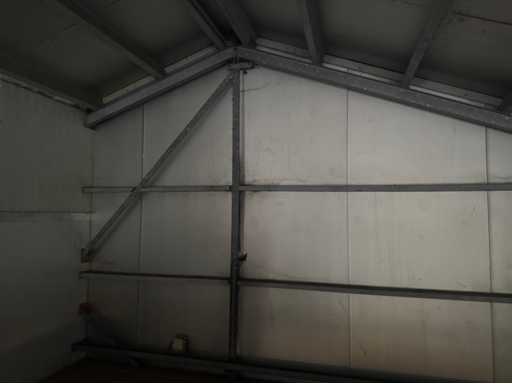 Construcție integrală din oțel galvanizat; deschidere liberă de 13000 mm; 7 compartimente de 4500 mm; lungimea totală a construcției este de 31.500 mm; înălțimea picioarelor 4500 mm; înălțimea crestei 6850 mm; verticale ale IPE 220; picioare cu grinzi realizate din IPE 220 mm; construcția fețadei terminale a IPE 120; acoperișul și fațadele sunt dotate cu învântuiri transversale și protecție împotriva vântului; acoperiș cu brațe din lemn; plăci de izolație pe țelurile de lemn; fără acoperiș exterior; O ușă deasupra de 4300 mm lățime și 4250 mm înălțime; cu pachet cu arc și șine; livrarea prin programare; este demontată de vânzător și pregătită pentru transport;