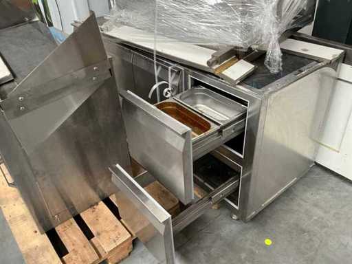 Deja dezasamblat. Constă dintr-un dulap de încălzire cu 3 sertare și un banc de lucru refrigerat cu 7 sertare.