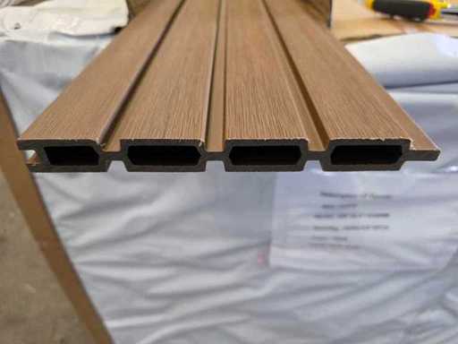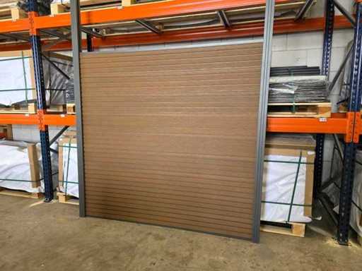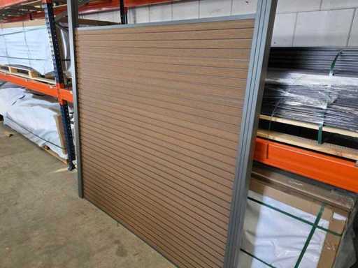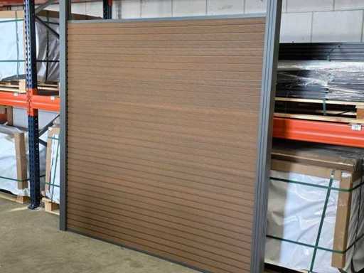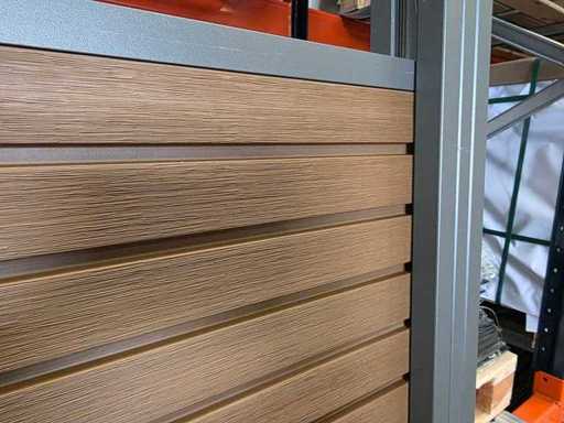 5 părți de împrejmuire din câte 9 scânduri fiecare, care alunecă una în cealaltă (180x180 cm), 6 stâlpi de gard din aluminiu cu sistem glisant, stâlpii trebuie să fie bine înfipți în pământ. Suporturi asortate pentru fixarea scândurilor, capace de acoperire, stâlpi, fâșie de finisare din aluminiu de jos și de sus, gard de întreținere slabă! Stejar colorat