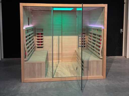 Nefolosit în cutie; Sumum Quatro – Saună cu infraroșu – pentru 4 persoane; Saună cu infraroșu spațioasă, cu finisaje luxoase și încălzitoare avansate; Potrivit pentru 4 persoane; Lemn de cicuță; cu sistem de muzică cu două difuzoare și Bluetooth; 3 emițători de carbon și 1 emițător cu spectru complet; Putere totală 3140W; Conexiune 230V; Greutatea proprie 365 kg.
