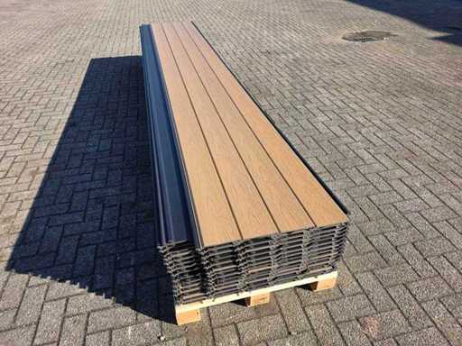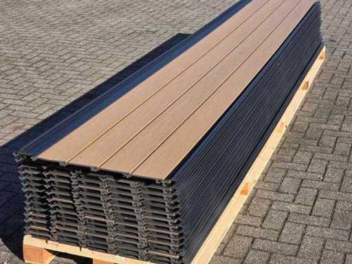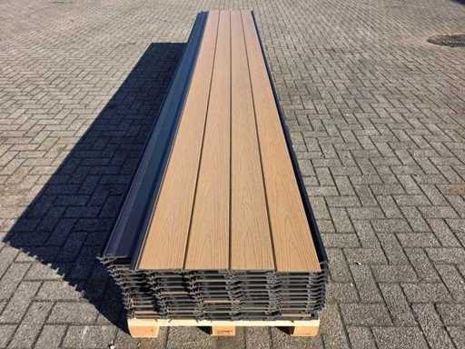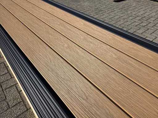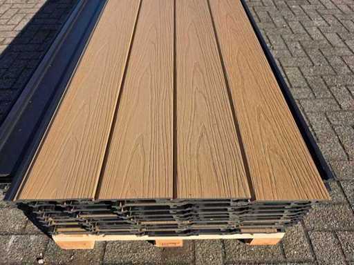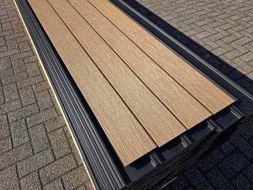 75 scânduri, culoare: tec, echipată cu strat de protecție împotriva coextrudării împotriva umezelii și radiației UV, cu fibră de lemn, lățime de lucru aproximativ 136 mm, aproximativ 40,5 m2, durată de viață lungă, neutilizată