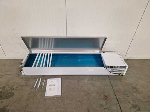 Vitrină frigorifică din oțel inoxidabil cu capac, potrivită pentru 7x coșuri GN1/3. Echipat cu răcire statică cu R600a, interval de temperatură de la +2 la +10 °C și o capacitate de 59 litri. Echipat cu picioare reglabile și funcționează la 230V (112 wați). Dimensiuni: 160 x 39,5 x 26 cm (LxAxH), greutate 61 kg.
