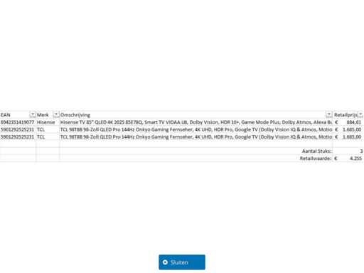 Aceasta se referă la un lot de televizoare returnate de la un mare retailer online. Petrecerea este formată din televizoare de diferite dimensiuni. Număr de piese: 3. Valoare de vânzare cu amănunt: €4255,- Televizoarele nu funcționează și pot fi folosite pentru piese. Vino în ziua vizionării pentru a înțelege motivul revenirii. Vezi fotografiile pentru lista conținutului.