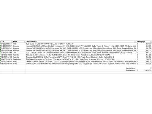 Aceasta se referă la un lot de televizoare returnate de la un mare retailer online. Petrecerea este formată din televizoare de diferite dimensiuni. Număr de piese: 10. Preț de vânzare cu amănuntul: €3425,- Televizoarele nu funcționează și pot fi folosite pentru piese. Vino în ziua vizionării pentru a înțelege motivul revenirii. Vezi fotografiile pentru lista conținutului.