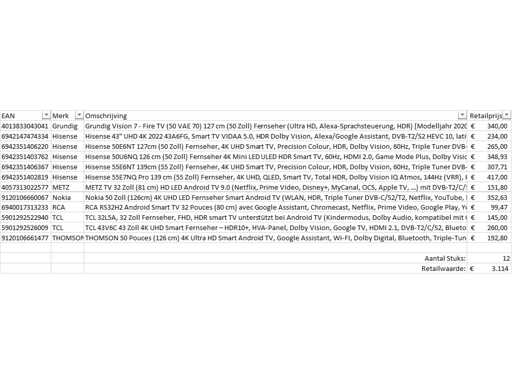 Aceasta se referă la un lot de televizoare returnate de la un mare retailer online. Petrecerea este formată din televizoare de diferite dimensiuni. Număr de piese: 12. Valoarea de vânzare în retail: €3114,- Televizoarele nu funcționează și pot fi folosite pentru piese. Vino în ziua vizionării pentru a înțelege motivul revenirii. Vezi fotografiile pentru lista conținutului.