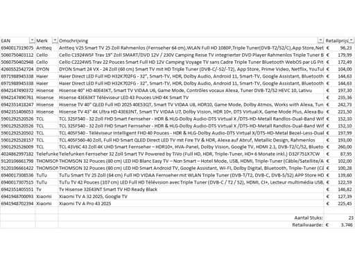 Aceasta se referă la un lot de televizoare returnate de la un mare retailer online. Petrecerea este formată din televizoare de diferite dimensiuni. Număr de piese: 23. Valoarea de vânzare în retail: €3746,- Televizoarele nu funcționează și pot fi folosite pentru piese. Vino în ziua vizionării pentru a înțelege motivul revenirii. Vezi fotografiile pentru lista conținutului.