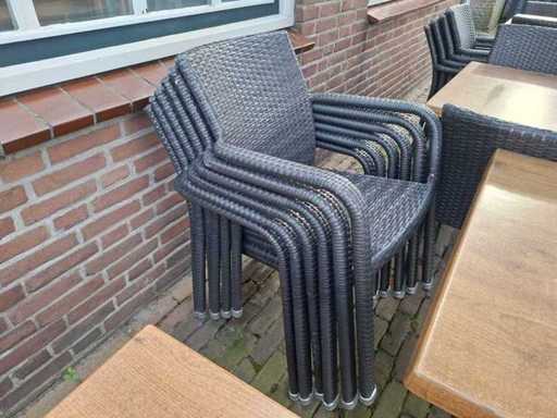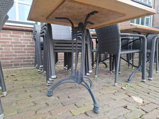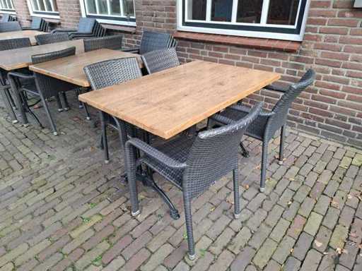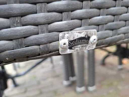 Constă dintr-o masă de 6 x 4 persoane de 120x80 cm, 6 x mese pentru 2 persoane de 80x80 cm cu blat de decor din lemn de stejar și bază de fier, 3 x blat de rezervă și 44 x scaun Sediamo.