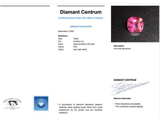 Piatră prețioasă: Topaz; Cantitate: 1 bucată; Tăietură: Tăietură cu pernă; Greutate (carate): aprox. 5,00 carate; Culoare: roz; Puritate: Puritate foarte ridicată; Starea: Nouă; Ambalare: Cutie cu pietre prețioase; Explicație: Evaluarea este o evaluare a unui comerciant certificat de diamante, bazată pe prețurile pentru consumatori; Preț pentru consumatori: 440 €,-