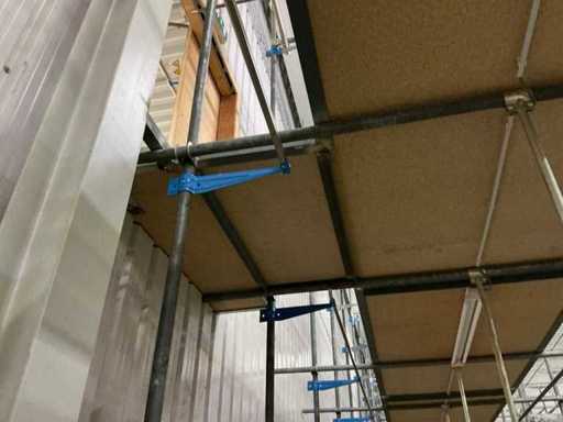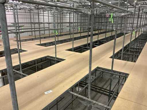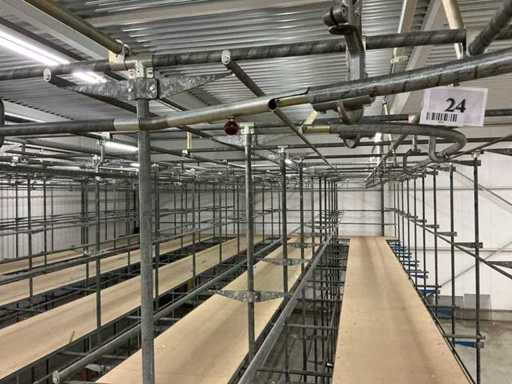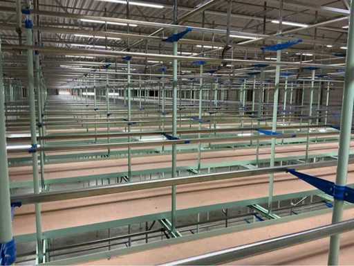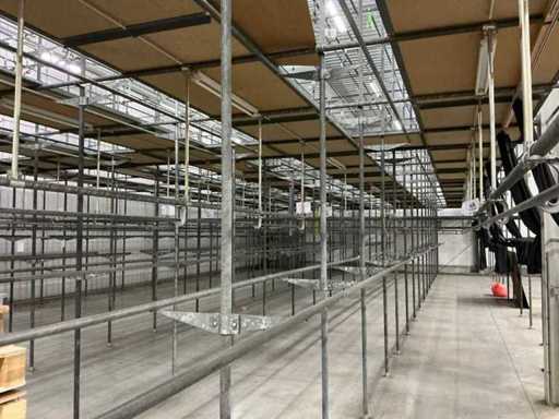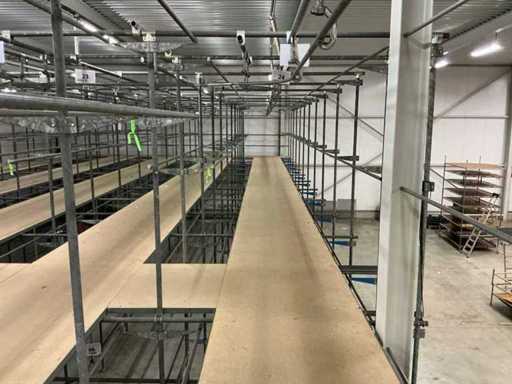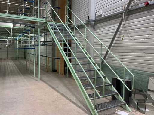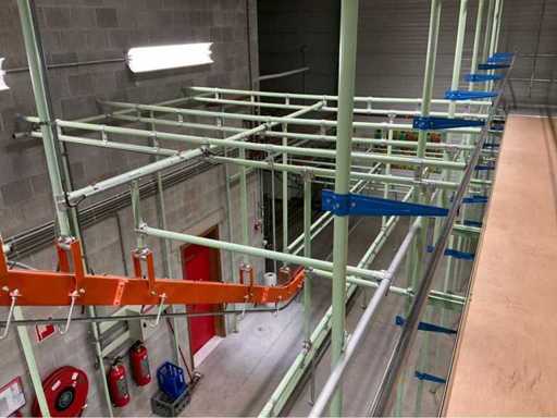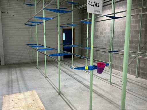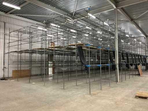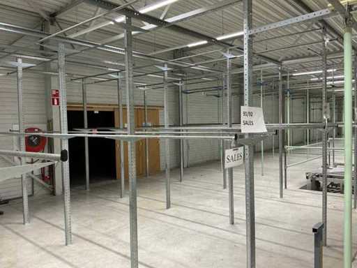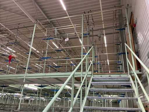 1. Two-level tube steel mezzanine construction with manual trolley rail system.