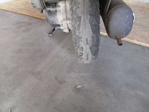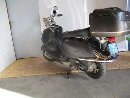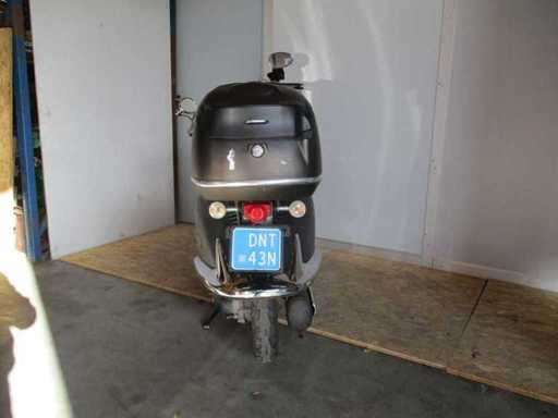 Scuter cu un set de chei, inclusiv top case colorat, motorul pornește. Starea întreținerii necunoscută.