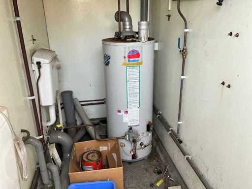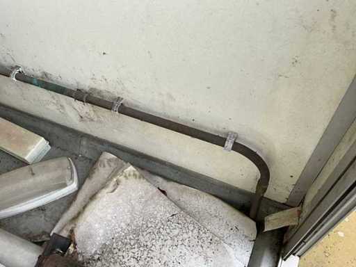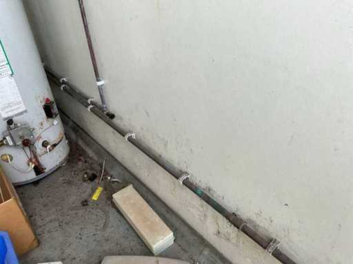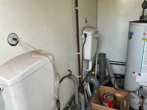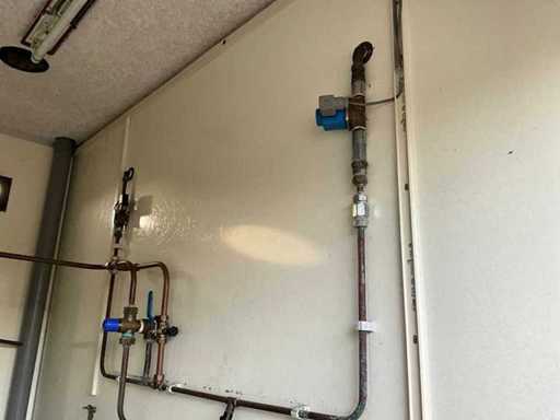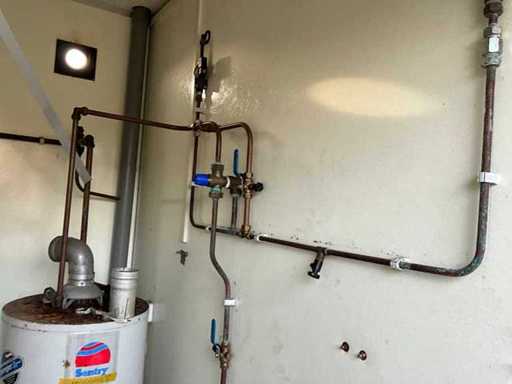 Technical room with sentry boiler, showers with timer, no shower head, 3x drain