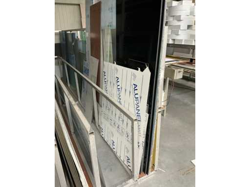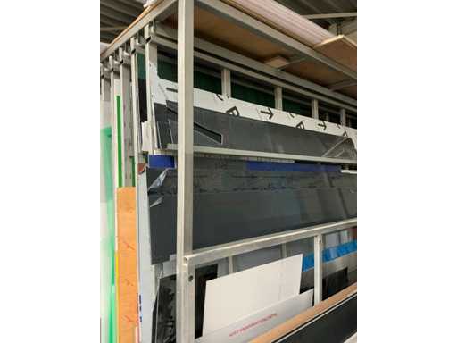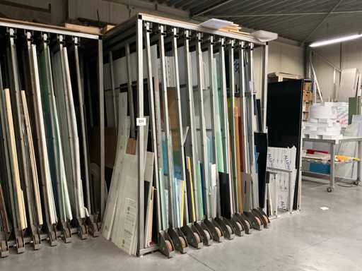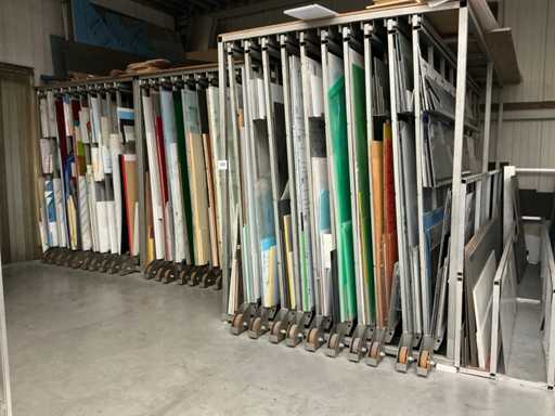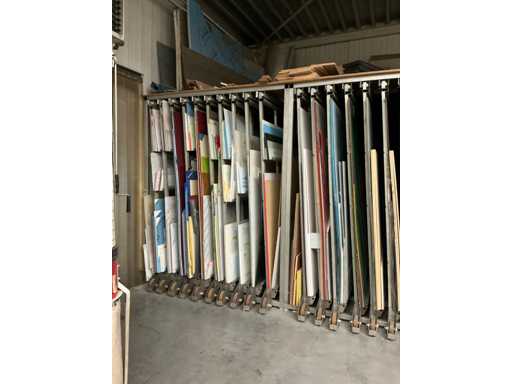 2 x Equipped with 10 roll-out record holders each approx. 300 x 250cm, 1 x equipped with 10 roll-out record holders approx. 195 x 400 x 250 cm Containing some miscellaneous PVC and wooden plates in various sizes and designs complete with aluminum attachment of approx. 84 x 400 x 133 cm with content