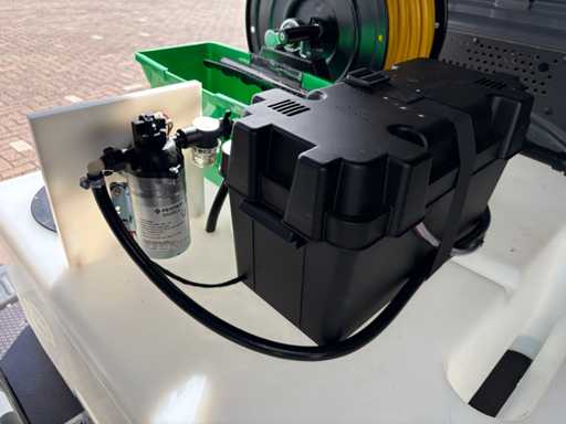 Incl. sistem complet Telewash. Tambur electric PowerUP3D de înaltă calitate, echipat cu 100 de metri de furtun cilindru armat de 8 mm. Pompă de 100PSI 5.3, filtru, varistreamer V16, baterie verde de 80ah.