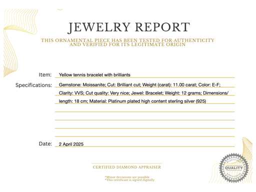 Gemstone: Moissanite; Cut: Brilliant cut; Weight (carat): 11.00 carat; Color: E-F; Purity: VVS; Cut quality: Very nice; Jewel: Bracelet; Brand: Harmony; Weight: 12 grams; Dimensions/length: 18 cm; Material: Platinum grade high grade sterling silver (925); Condition: New; Packing: Jewelry box or velvet case; Explanation: The quality has been taken from the report belonging to the item. The valuation is an assessment of a certified diamond dealer, based on consumer prices; Additional information: The measured weight of the gemstones is according to diamond sizes; Consumer price: € 1,600