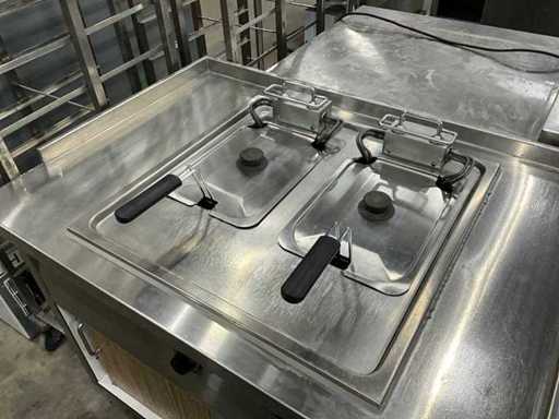 Echipată cu friteuză dublă, tavă de copt și chiuvetă cu robinet.
